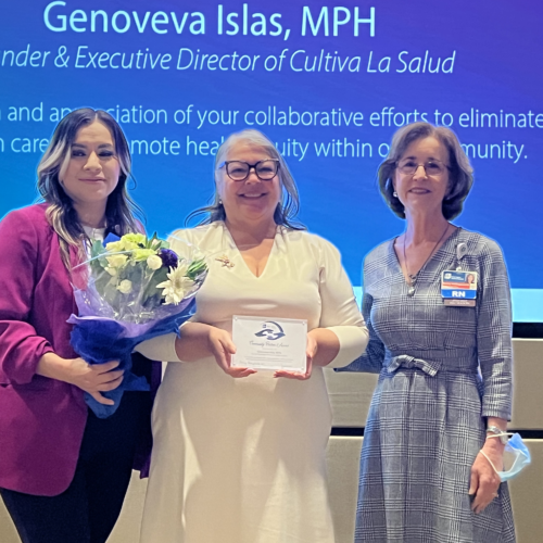 On Martin Luther King’s Day, Genoveva Islas, Cultiva La Salud Executive Director, was awarded Saint Agnes Community Partner Award for Cultiva La Salud's collaborative efforts to eliminate disparities in care and promote health equity within our community. // En el día de Martin Luther King, Genoveva Islas, directora ejecutiva de Cultiva La Salud fue galardonada con el premio Socio Comunitario de Saint Agnes gracias a la dedicación por parte de Cultiva La Salud para eliminar las desigualdades en el cuidado de salud y promover la equidad sanitaria dentro de nuestras comunidades.